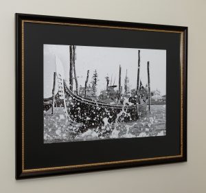 Black &white photograph of Venetian gondola mounted and framed using black beaded frame.